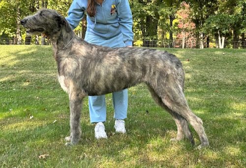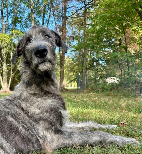 Sissi was an eye catcher right from the start. A very light gray brindle among 10 dark siblings, she reminded us of her half sister Romy, including the striking markings. Of course she stayed – no regrets whatsoever! Sissi is a very agile girl, light on her feet with great reach and drive, and she loves to go hunting in the woods. Equipped with an incredible zest for life, she is super clever as well – which makes it very fun to live with her.